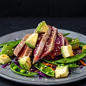 Стейк из розового тунца с молодыми цуккини, спелым авокадо и соусом из лемонграсса
