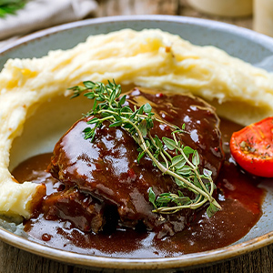 Томлёные говяжьи щёчки на сливочным пюре с красным виноградом и соусом Порто