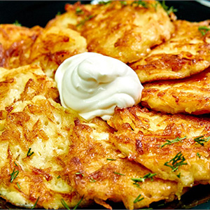Драники с лососем и малосольными огурцами